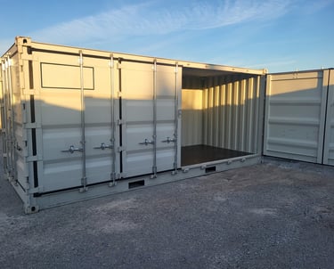 20'L x 8'H x 8'W. One-trip tan container. Excellent shape, as new as you can get. Easy to open doors.